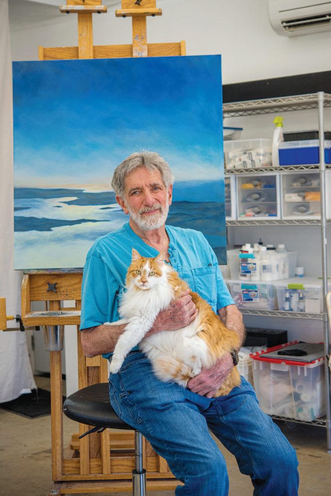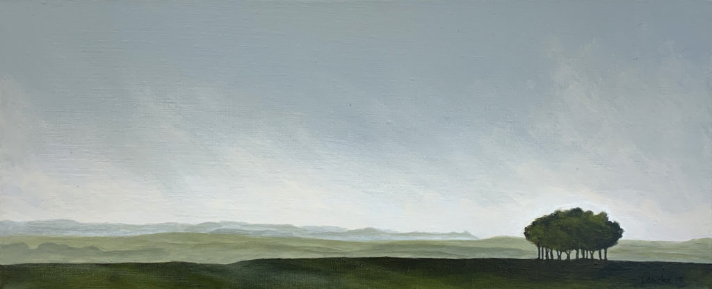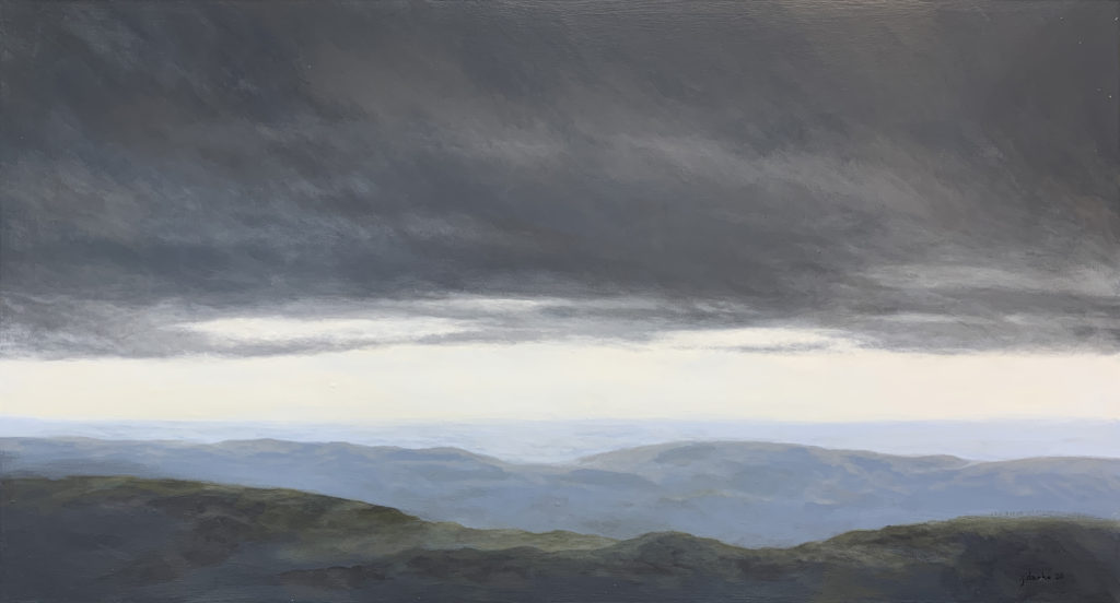 My artwork reflects spending a good part of my life exploring the ocean of air above us and studying the earth’s surface while aloft. The intersection of these two worlds at the horizon is of particular interest to me. Although the exact nature of the subject matter is not always apparent, the feeling of a large scale look at the land and sky is the essential part of what I am trying to do. From aloft, the vastness of the atmospheric ocean makes human activity seem insignificant. I have always found sanctuary there and I would like to put a little of that down on canvas.