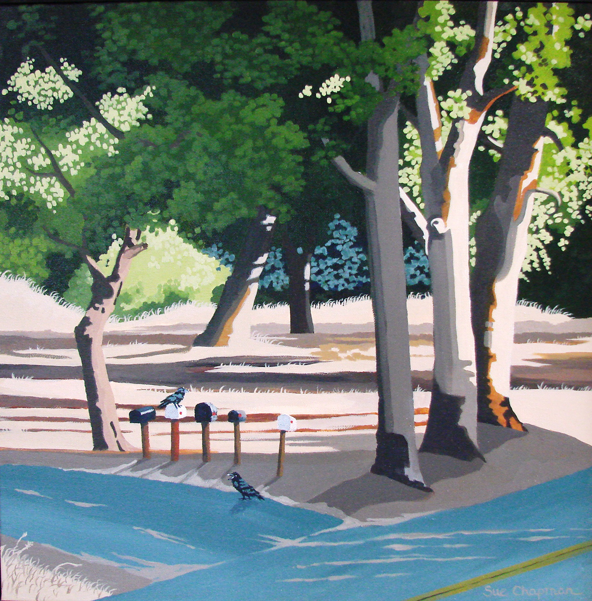 Northern California Artist, Sue Chapman, has resided in El Dorado Hills since 1983. She earned her BFA degree from the University of Illinois School of Fine and Applied Arts. Sue uses acrylic on canvas for her plein air landscapes of the surrounding foothills. A common element in her work is the use of color and contrasting value for dramatic effect. Her graphic style is a unique mix of realism and impressionism.