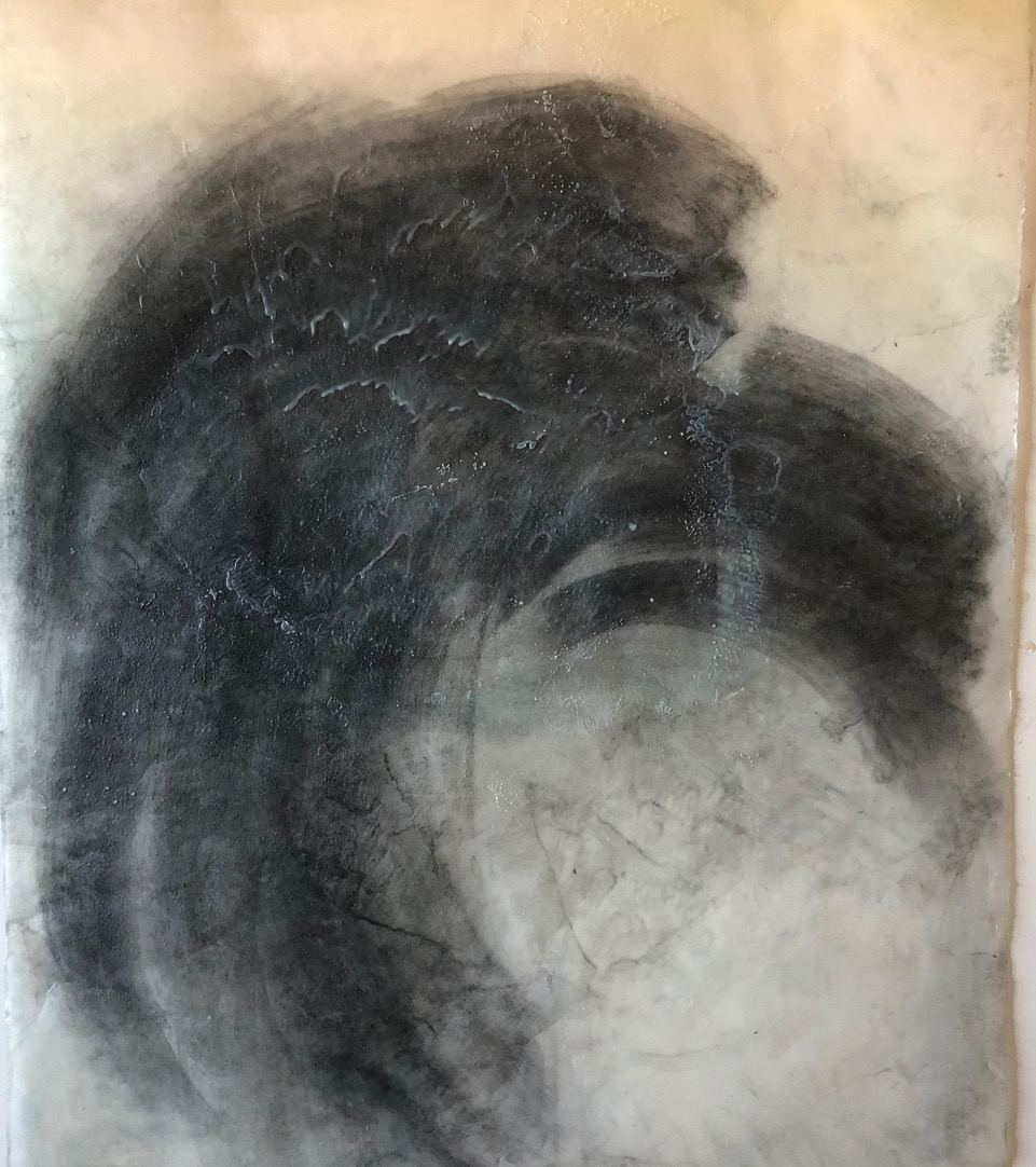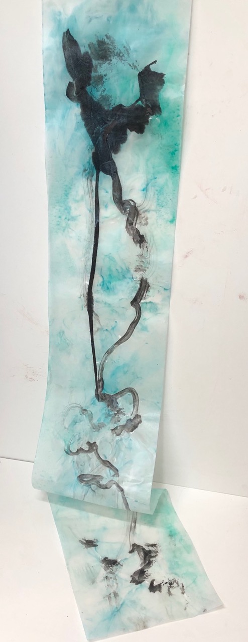 Cooper for this exhibit, is showing works created with wax and resin encaustics on a Japanese paper that is both strong and delicate.  By using encaustics, the ancient favorite of Greek portrait painters, the scrolls created are full of light and color and move on currents of air.  Cooper says she loves the texture and materiality of the encaustic medium and it’s dual ability to carry pure loads of color and still be characterized by translucency.  She first saw encaustic works in a gallery and wanted to touch them, to smell them, and then to see what she could do with this medium.  Then is when she left behind watercolor and forged metals to explore encaustics.  Although she have now been working in this way for 15 years, each piece feels like the beginning of a new adventure.