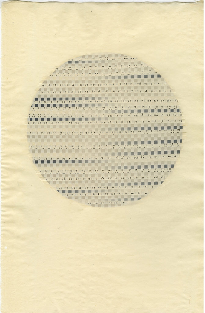 Interdisciplinary artist Steph Rue presents a series of drawings and books, exploring contemplative prayer practices in the Christian tradition. Through papermaking, letterpress printing, repetitive mark-making, weaving, sewing, and collage, the experience of prayer is captured in the process of making and viewing the work. Drawings on paper were formed by hand out of gampi or kozo fibers using the Japanese method of papermaking called nagashizuki.